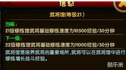 技巧:武将馆每提升一级每30分钟提升500经验。我们优先升级官府等级和武将馆,这样可以获得更多修炼经验。