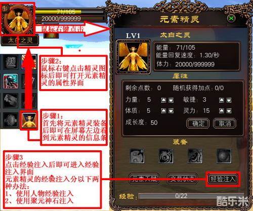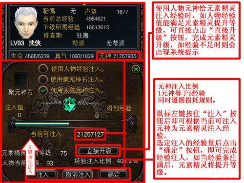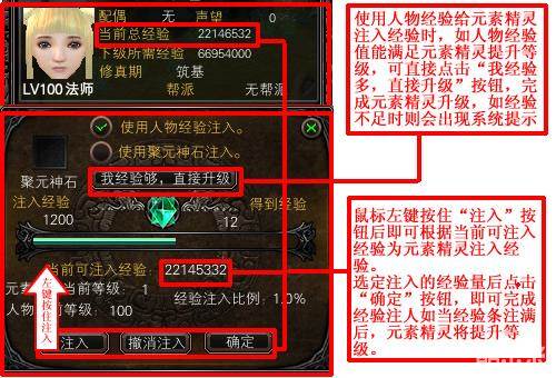 1、玩家无法给高于自己等级的元素精灵注入经验。(不论是注入人物经验还是使用经验道具)