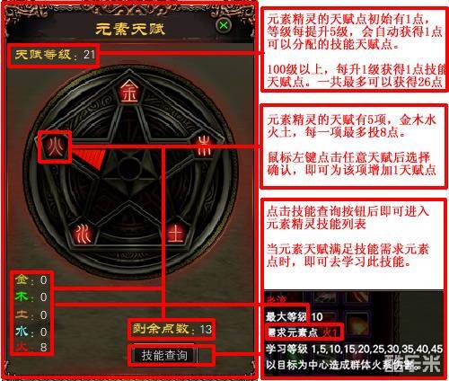 元素精灵的天赋有5项,金木水火土,每一项最多投8点。