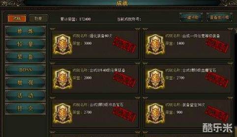 成就系统记录着玩家达成的成就项,完成成就可获得一定奖励和功勋值,达到特定功勋值即可获得头衔,并可领取相应头衔的勋章,勋章可佩戴,可强化,可镶嵌宝石,是提升战力的最佳途径之一。通过快捷键“I”可打开成就面板,如下图所示: