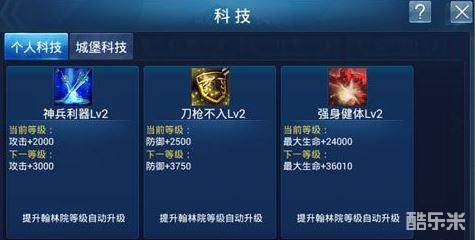 2、城堡科技为服务器共有,城堡统帅才能够升级,本服所有玩家都可以享受加成。