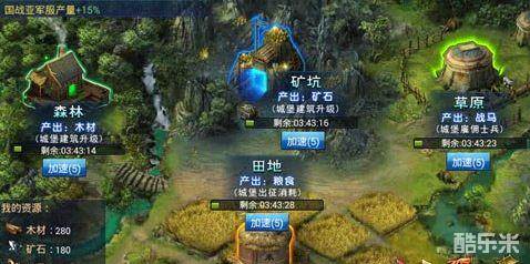2、玩家在森林中可以获得木材,在矿坑中玩家可以获得矿石,在田地中玩家可以获得粮食,在草原中玩家可以获得战马。