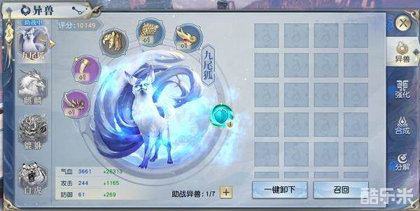 异兽有生命、防御、攻击三条助战属性,异兽装备则另有特殊属性。装备和强化异兽装备可获得额外属性加成。收集齐5件装备后可激活异兽,属性加成均在助战后才可获得,助战后加成效果直接增加至各位道友。激活异兽后可选择助战,助战的异兽也可选择召回。在已激活的异兽中可以任意切换异兽助战。在这里貂爷提醒一下各位道友哦,助战多个异兽时,相同技能只生效一个,若相同技能不同等级,则生效等级高的技能效果。