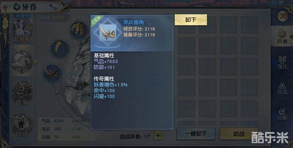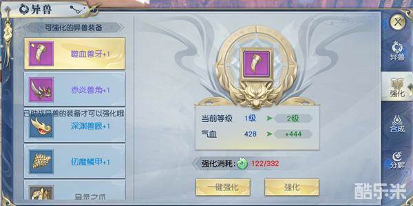 助战中的异兽装备可进行强化,强化通过消耗兽元升级,从而提升属性加成。不同品质和等级的装备强化所需兽元数量不同,强化装备有等级上限,支持一键强化。