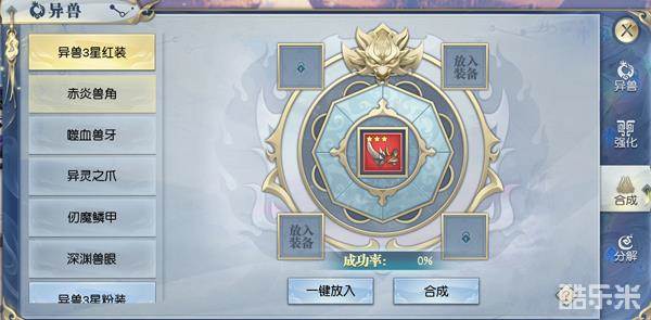 异兽装备合成规则和装备合成系统相同(4合1,一次合成1个),支持配置多个父级和子级。貂爷给大家整理了一下,3星红装=3件2星红色装备,3星粉装=合成材料+三件3星红色装备。道友也可放入已强化的装备进行合成哦。合成成功后,放入装备的熟练度将继承至新装备,并转换为新装备的强化等级。合成失败则放入装备销毁,若放入的装备含有强化等级,熟练度也会随之销毁。