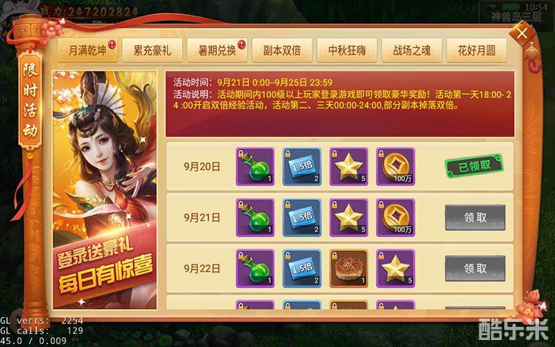 活动说明:活动期间内,第一天经验翻倍,第二、三天特定副本双倍掉落,道具奖励超爽翻倍!