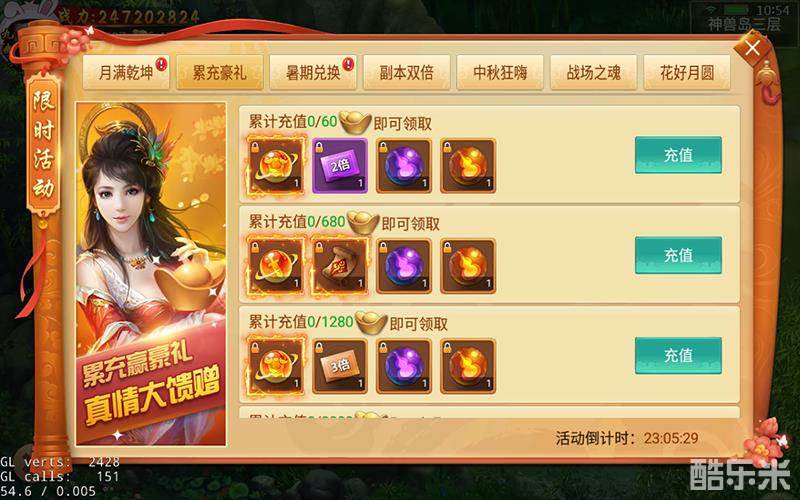活动说明:累充送豪礼,真情大回馈,活动期间累计充值达到指定元宝,即可领取多倍经验卡、法宝潜能丹,极品时装幻化等丰厚大礼!