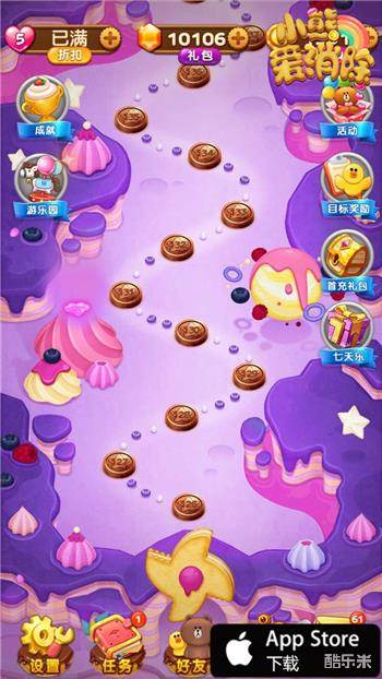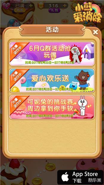 随着盛夏的到来,近期最让人期待的莫过于六一儿童节了,无论身处于哪个年龄层都能在这天放飞自我,一同重温自己久违的童心,而超人气手游《小熊爱消除》在这么重要的日子里自然有惊喜。在《小熊爱消除》游戏的全新版本中,六一活动也在近期上线与玩家们见面,玩家们挑战和61相关的指定关卡,分数越高,越有机会获得超丰厚的活动奖励哦!而在游戏的全新版本中,玩家使用微信分享功能,与更多朋友分型自己在《小熊爱消除》游戏中的点点滴滴,更有机会获得LINE正版授权的布朗熊、可妮兔周边玩偶哦!线上线下全面联动,一起在六一活动中把好礼带回家吧!