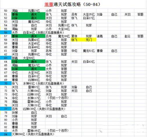 这里有一张通天试练1-84的通关表,大家可以保存下来(保存下来就是原图)(后续还会更新混服的。)