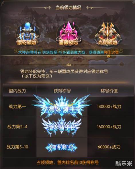 战力排名第一的将获得领主称号,称号战力180000+;战力第2-4名获得骑士长称号,称号战力160000+;战力第5-10名获得骑士称号,称号战力60000+。每位玩家头顶上的称号都将代表着联盟的荣耀,别人远远看见也会避让三分。为了游戏内的公平,每小时刷新的战力将减去领地称号与免伤守护带来的战力加成。同时战神们也要注意开服第7天晚上最终结算前要盯紧排行榜,切忌放松警惕被别人赶上,抢走了称号。