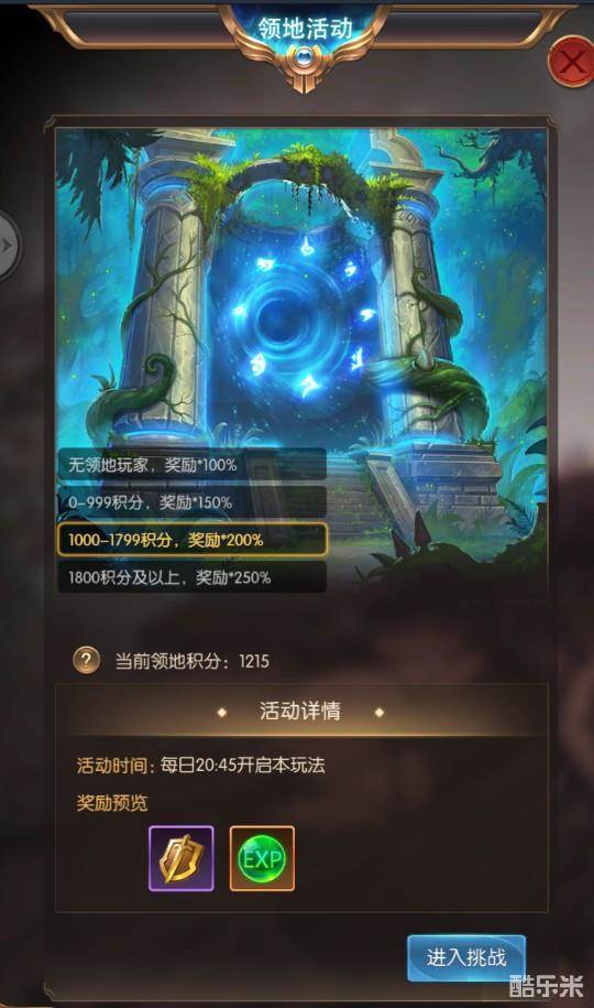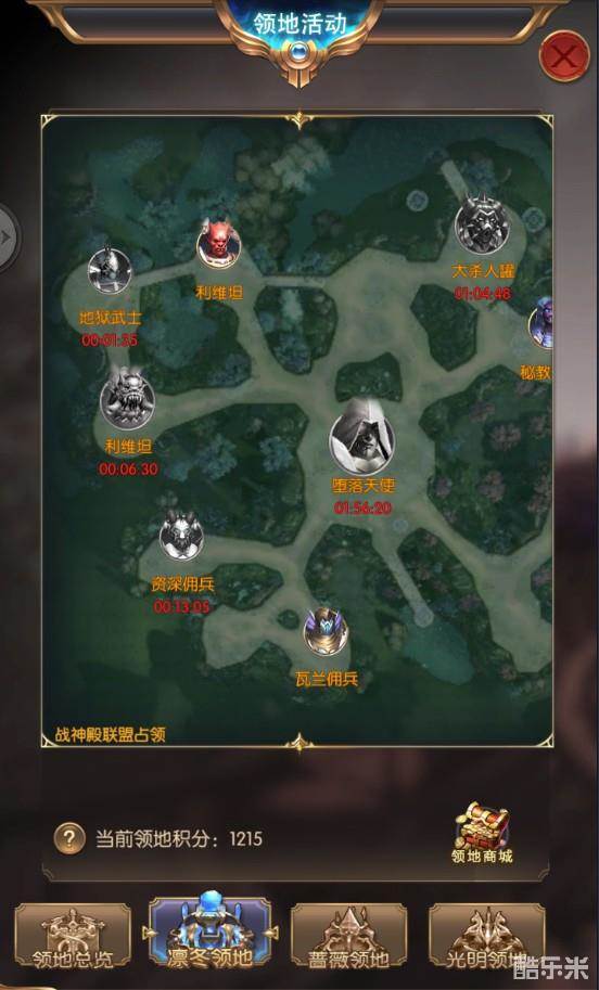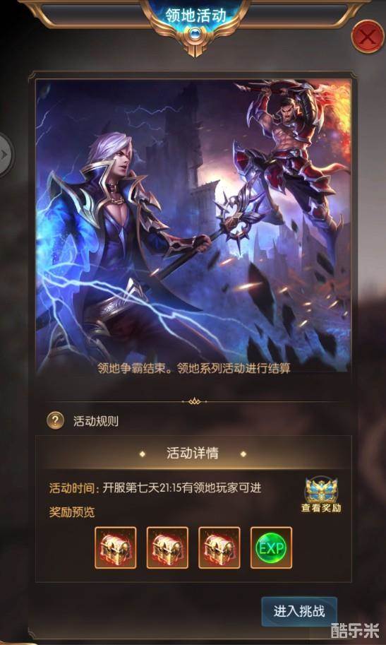 开服第7天晚21:15开启,3个占领领地的联盟成员可进入领地争霸战场,击杀敌对成员和怪物可获得积分,最终分别按照联盟总积分排名和个人积分排名获得稀有圣印奖励和大量经验奖励;