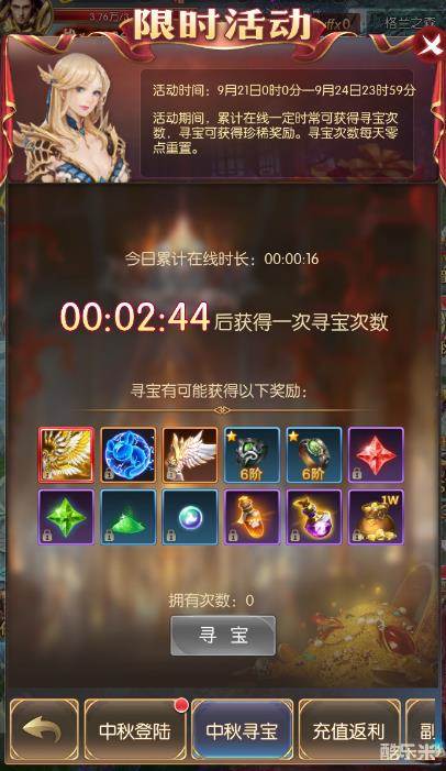 活动规则:挂机在线时长达到要求,即可获得寻宝次数。每天可获得最高8次寻宝机会!