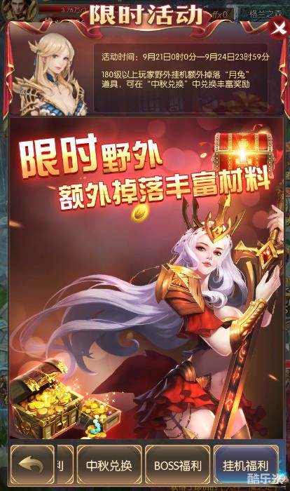 中秋就要来临,魔幻大陆也掀起了东方节日热潮,可爱的月兔等待各位战神大驾光临。借此佳节,极品坐骑寒冰翼龙闪亮登场!丰富活动,等你来战!先来一睹为快吧~