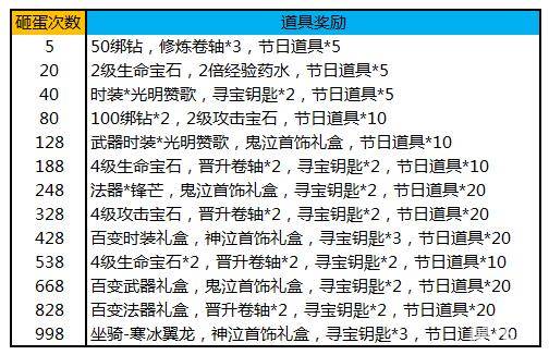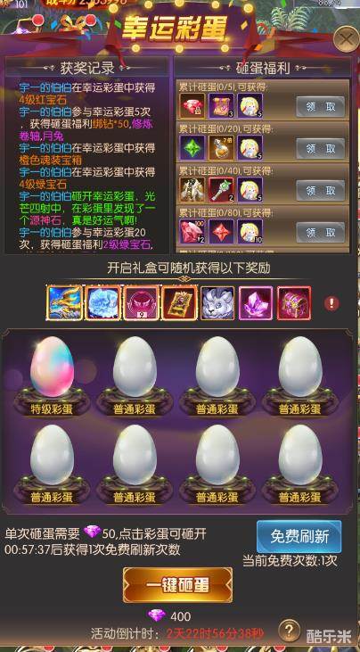 活动规则:通过消耗钻石,砸开随意彩蛋即可获得奖励。每天可获得4次免费刷新彩蛋次数,欧皇附身时能砸到极品坐骑宠物!累计砸蛋达到一定次数将必然获得对应奖励!