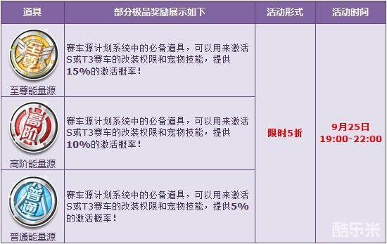 9月25日19:00-22:00期间,【至尊能量源】【高阶能量源】【普通能量源】限时5折,助力赛车源计划,千万不要错过哦!