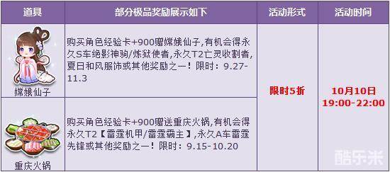10月10日19:00-22:00期间,两款人气宝箱【嫦娥仙子】【重庆火锅】限时5折,开启就有机会赢得永久S车绝影神驹/炼狱使者,永久T2亡灵收割者/雷霆机甲/雷霆霸主,永久A车雷霆先锋等,千万不要错过哦!