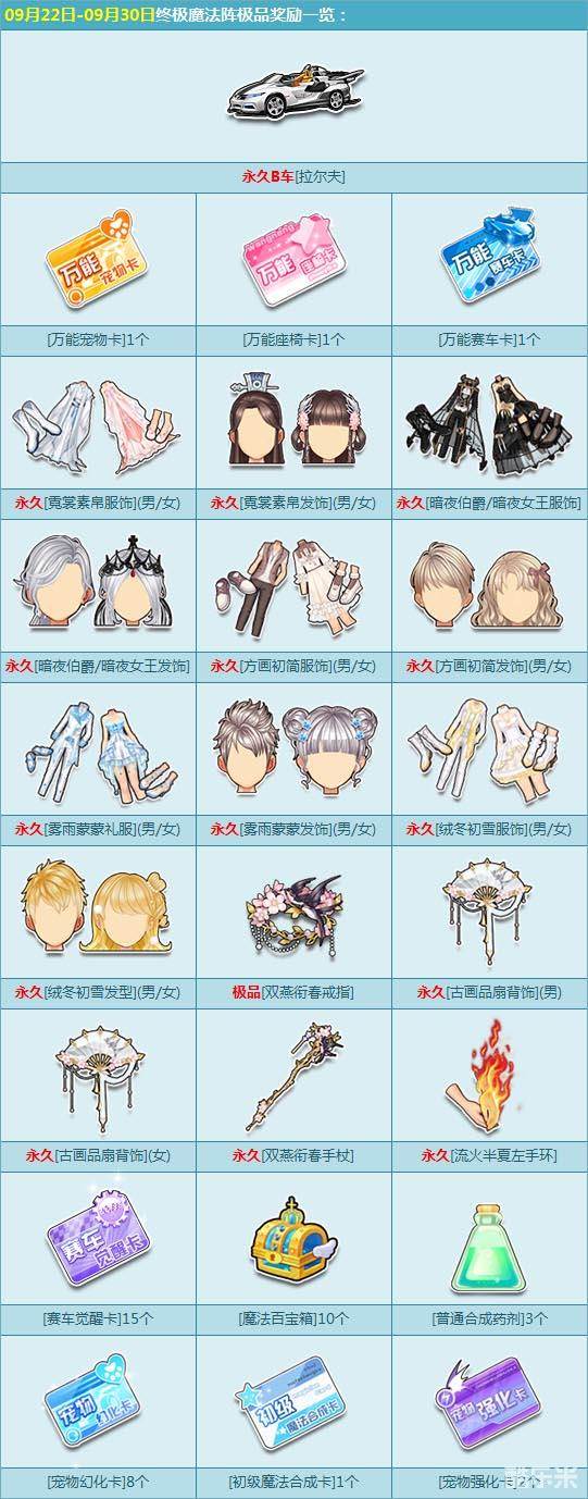 9月22日-9月30日期间,终极魔法阵开启,有机会赢取【霓裳素帛发饰】/【霓裳素帛服饰】等首发极品,还有【万能宠物卡】、【万能座椅卡】、【万能赛车卡】三卡连发,赢各式极品宠物、极品座椅及极品赛车,魔法阵中秋送礼,赶紧来参与!