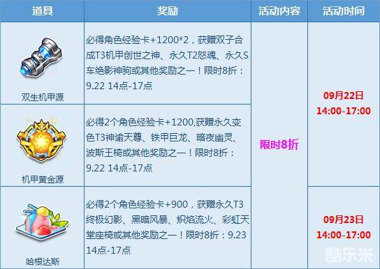 9月22日-23日每天14:00-17:00期间,【双生机甲源】、【机甲黄金源】、【哈根达斯】三款宝箱限时8折,有机会得永久T3【创世之神】/【神谕天尊】/【终极幻影】等机甲极品,T3狂欢,感恩有你,赶紧来参与!
