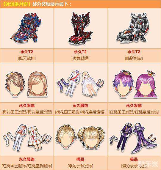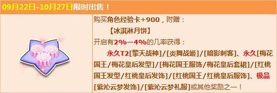 9月22日-10月27日期间,购【角色经验卡+900】,赠送冰淇淋月饼,有机会得永久T2【擎天战神】/【炎舞战姬】/【暗影刺客】、永久【梅花国王发型/梅花皇后发型】/【梅花国王服饰/梅花皇后套裙】/【红桃国王发型/红桃皇后发饰】/【红桃国王/红桃皇后服饰】、极品【紫沁云梦发饰】/【紫沁云梦礼服】或其他奖励之一!其中核心奖励期限型概率为4%-6%,核心奖励永久型概率为2%-4%,非核心奖励概率为90%-94%。