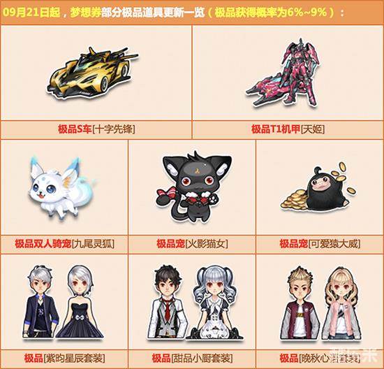 9月21日起,只需1Q币购买【梦想券】,开启有机会获得:极品S车【十字先锋】,极品T1【天姬】,极品宠物【九尾灵狐】/【火影猫女】/【可爱猿大威】,极品套装【紫昀星辰套装】/【甜品小厨套装】/【晚秋心语套装】!获得以上极品概率范围为:6%~9%,获得非极品概率范围为:91%-94%。