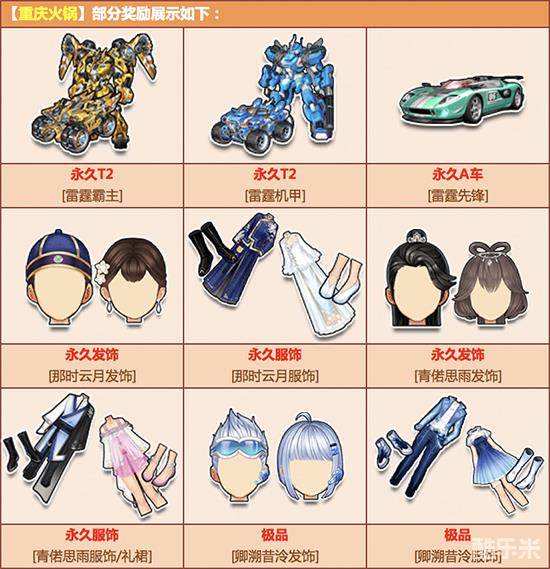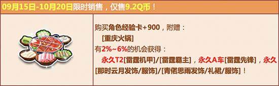 9月15日-10月20日,购买角色经验卡+900,赠送【重庆火锅】,有机会得永久T2【雷霆机甲】/【雷霆霸主】、永久A车【雷霆先锋】、永久【那时云月发饰/服饰】/【青偌思雨发饰/礼裙/服饰】或其他奖励之一!其中核心极品期限型概率范围为:4%-6%,核心奖励永久型概率范围为:2%-4%,非核心奖励概率范围为:90%-94%。