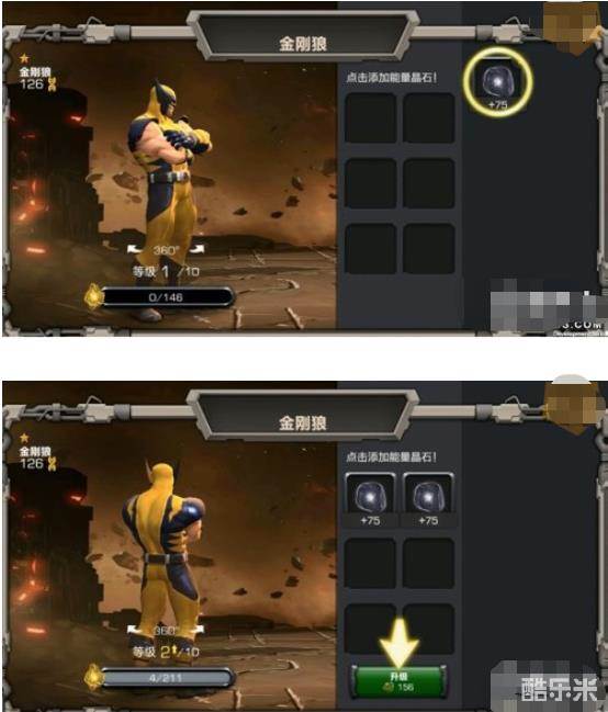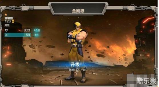 英雄下方是经验条,经验满了之后我们就可以将金刚狼升级到2级了。升级后的金刚狼在血量以及攻击力方面,都有了显著提升。