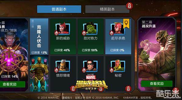 普通副本共4幕,每一幕共4章,每一章共6个副本,每个副本中又包含多个关卡。每一幕都是一个完整的故事,大到每个章节都是息息相关,小到每个关卡都环环相扣,在您完成副本的同时,也可以了解漫威格斗中精彩纷呈的故事背景。