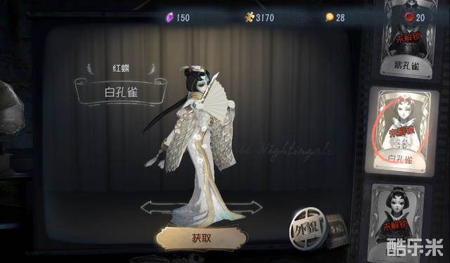 这位史上颜值最高的艺伎小姐姐红蝶,不管是原画还是皮肤都非常好看。在游戏中,红蝶不仅能自由切换双形态,技能还贼6,相信许多求生者看到红蝶都要窒息了吧!这款白孔雀的皮肤,和其他皮肤不同,以白色为主色调,原本以为白色是一个能让人放松的颜色,但是配合上红蝶的妆容和"漂移"的技能,仿佛是一个女鬼来抓人了,非常可怕。