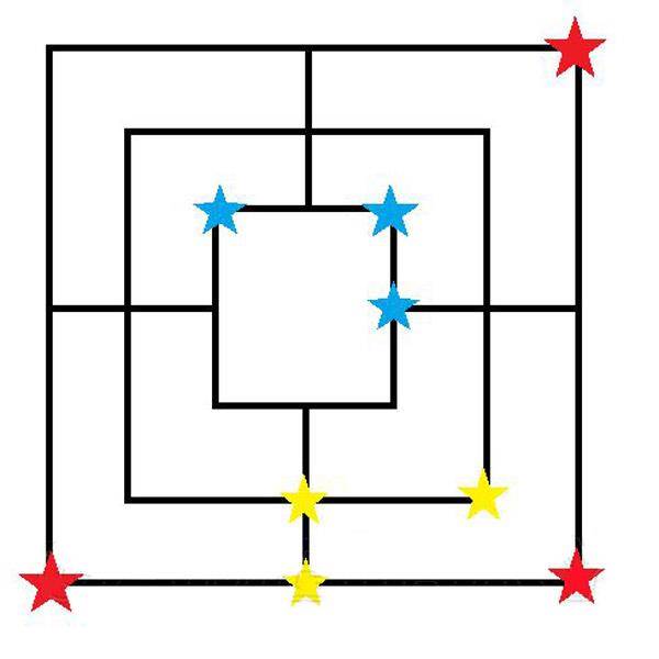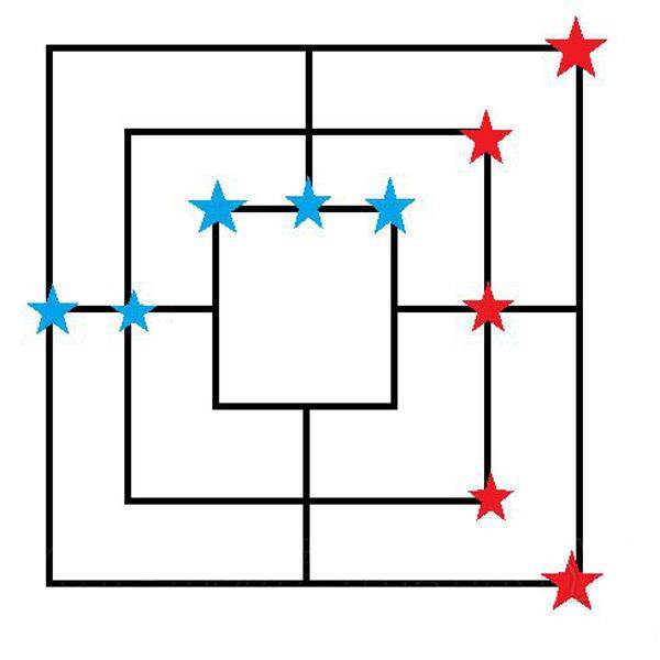 当我们吃掉对方的1-2个棋子之后,你也剩下不了几个棋子了,意思就是说摆棋的阶段就要结束了,下面就要移棋子了,下面我们就要开始构建像下图中的蓝色或者红色所示的连杀阵型飞,这样可以保证一个回合吃一个。