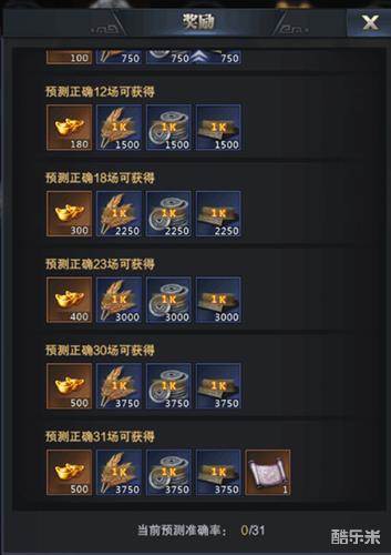 官渡之战S5新赛季中,季后赛也相应做出调整升级。三个联赛均有对应的季后赛,即本联赛32强,三个联赛季后赛将同时进行。观赛的主公们可选择所有联赛进行观赛,并且可竞猜每个联赛各16场比赛,一共48场,各联赛竞猜奖励相同,但是赛程预测活动只能在冠军联赛中进行。竞猜成功将会有元宝、粮草、银两、铁矿等丰厚资源奖励,竞猜成功率越高,奖励越丰厚!