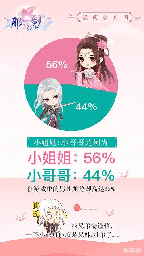 所以游戏中女性玩家的比例高于男性玩家也是毫无意外的啦!然而万万没想到的是游戏中的女性角色却只有39%......是游戏中男性角色太帅气还是风流倜傥的形象太吸引人,小姐姐们竟也沉迷男角色无法自拔!