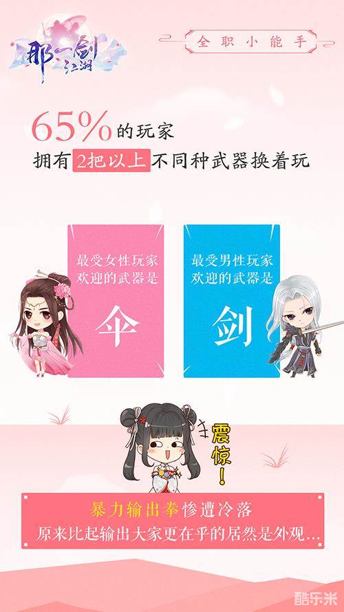 游戏中的大部分玩家都会随时准备2把以上武器,根据野外、团战、单挑、竞技等不同战况,选择不一样的武器应战。而最受男性和女性玩家欢迎的武器分别是剑和伞。两个都是武器家族里的颜值担当哦~
