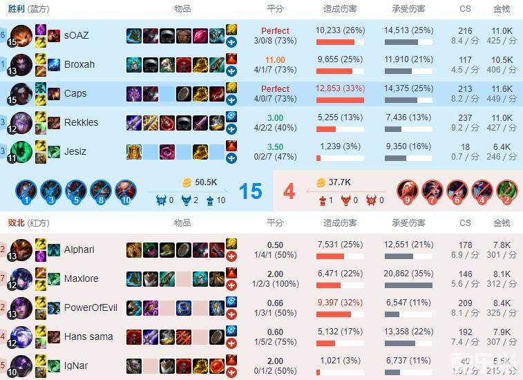 在锯齿短匕之后,Caps选择了五速鞋,积极游走的打法,第一个大件自然是这个版本最强的德拉克萨的暮刃,第二个大件是幽梦之灵,在第三个大件黑色切割者出来后就能堆满40%冷却缩减。由于这场比赛前期拿到对线优势和游走收获人头,13分钟的时候Caps就选择变身为暗影刺客,直接走爆发流路线。