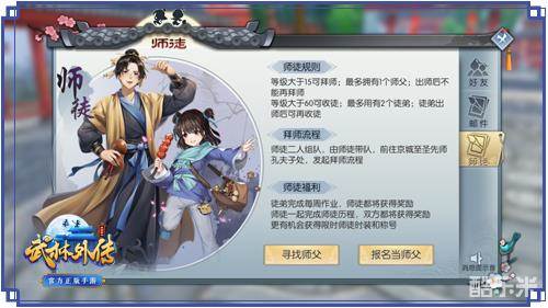 小白等级大于15级,师父大于60级便可结为师徒。在好友界面的师徒栏里,可发布和查阅信息,经过一番了解互相锁定之后,便由师父带队前往京城,在孔夫子的见证下完成拜师仪式。自此,江湖之路有人作伴。