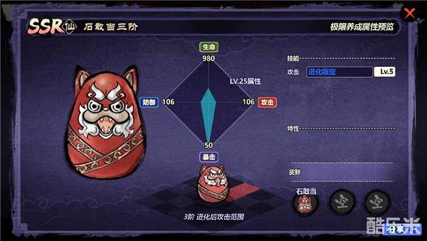 妖怪的进化除了能大幅提升能力值外,还能提高等级上限。1阶的妖怪最高只能升到10级,但经过进化后,最高可达30级,而且最重要的是在3阶进化后,各妖怪的攻击范围会得到大幅提升。看到这你就知道作为万能进化材料的石敢当有多么重要了吧~
