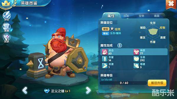 正义之锤如其外表一样,厚实强硬,作为开局就送的肉盾,其技能具有回血,加防,嘲讽,是个非常强力的英雄!作为免费英雄,其完美的技能特性,当然是有的话练起来吧!