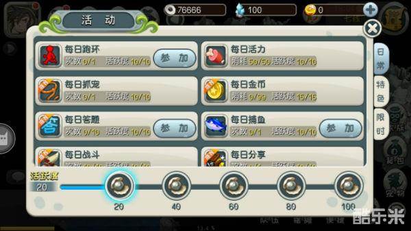 日常活动包含:每日跑环、每日活力消耗、每日抓宠、每日金币消耗、每日答题、每日捕鱼、每日战斗、每日分享、每日加工、每日刷楼、每日竞猜。