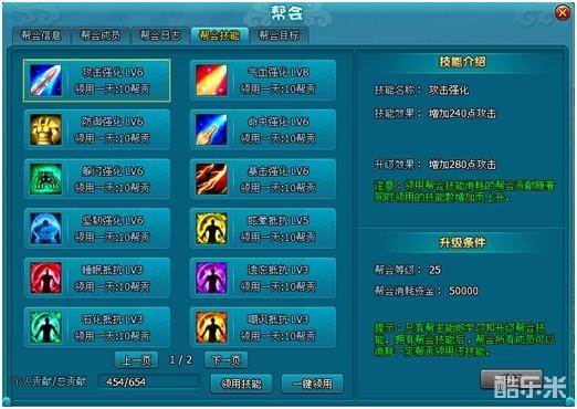 在40级后上线第一件事,做帮派任务,刷帮贡。 然后点开帮派技能。认领帮派技能, 这个是24小时的BUFF,而且好的帮会的技能可以给玩家加很高的战斗力啊,当然第一时间领好。