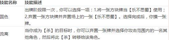 国色:技能来源应源自其容貌甚美,国色天香。十分典型的辅助技能,控场+过牌二合一。一方面国色仍旧使用乐不思蜀限制对方回合,另一方面,国色首次增加为队友解乐的功能。此外,在方片当乐or解乐使用后,大乔还能额外摸一张牌,弥补了其手牌消耗。