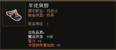 神鬼幻想学徒肩膀属性介绍,学徒肩膀是魔导师的防具,下面这张图里面的职业是错误的,因为很明显智力对狂战士没有效果,所以这是魔导师的防具。