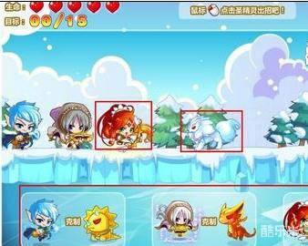 根据屏幕下方的相克表,当前方出现了一种怪物后,小奥比们点击与怪物相克的精灵,精灵就会把怪物消灭掉。