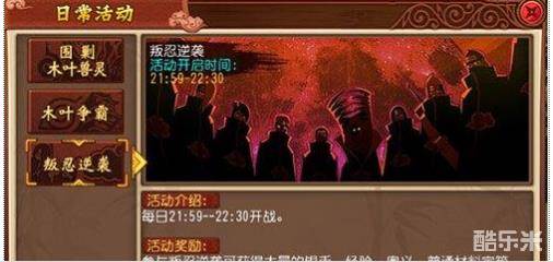 忍者风暴每日活动的叛忍逆袭是每天的最后一个活动。开启时间是晚上22点到22点30,也是玩家睡觉前最后的疯狂。