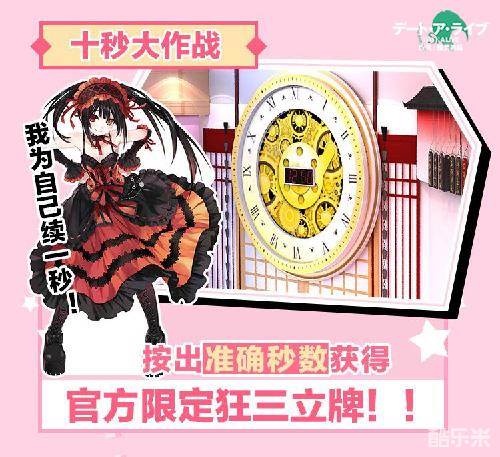 在展台的右侧则是一块仿刻刻帝制作的时钟,它将为狂三代言(我为自己续一秒)--十秒大作战。想要挑战这个活动的玩家可要把神经绷紧了,因为你只有一次机会按出10:00秒!按出准确秒数的玩家可以直接获得官方限定狂三立牌!!!