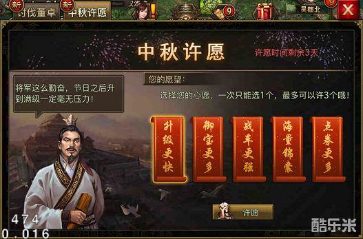 d. 活动开始时,角色等级大于150(含)的玩家,可许的愿望种类有5个,分别为“升级更快、点券更多、兵器更高、大批丝绸、海量锦囊”,点选即可许愿;