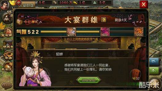 活动内容:活动期间,玩家通过送发请帖宴请群雄,可获得相应奖励。同时邀请到品质相同的三位武将时,可增加气氛值。当气氛值达到指定值时,可获得额外奖励。