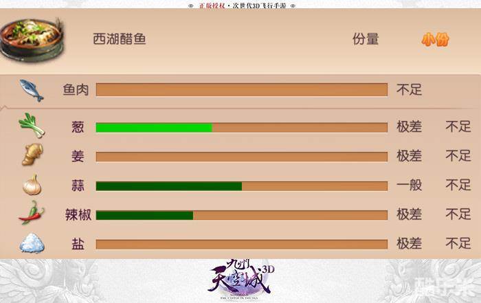师徒根据不同的菜肴食谱来收集食材,收集适量的食材来完成美食。菜肴会根据食材的收集程度来评分,刚刚好的收集程度意味着菜肴将获得绝佳的口味,评分也会越高。菜肴分为小、中、大份,越大份的菜肴要求越高。食材会显示出不足、正好和过量,食材一定要收集适量,不足和过量均会影响最终的烹制结果。