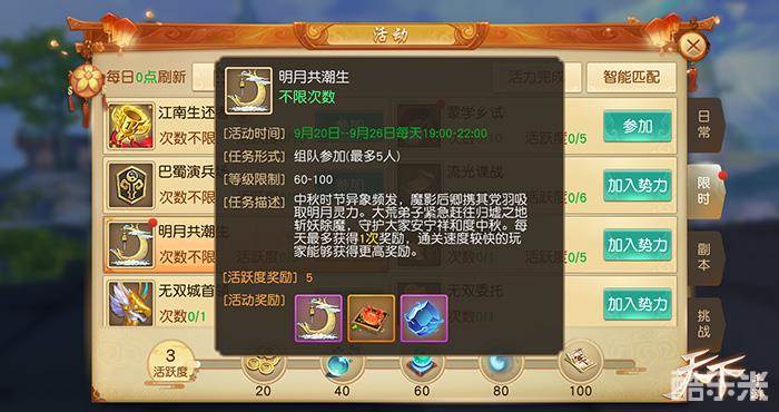 春江潮水连海平,海上明月共潮生。这个中秋,你赏月了吗?想让明月常伴身边,就来《天下》手游中秋新副本“明月共潮生”!中秋时节大荒异象迭起,幽都妖魔吸取明月灵力,快来用你的火眼金睛揪出凶邪天狗王,夺回美味大闸蟹吧!维护大荒安宁的重任就交给帅气有为的少侠你了!战力爆表的少侠若能速度通关,还可凭借“大荒小红手”赢得中秋副本附赠的唯美弯月坐骑“广寒玉舟”呢!今天(9月26日)是中秋副本的最后一天,打副本赢弯月的机会可千万别错过,抓住时机速来一战吧!