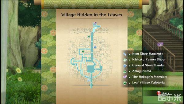 Step1:我们要去木叶村地图的中间,从上到下顺数第二块片区,看到图上浅蓝色的地方就是小蛤蟆所在之处,亦即使纲手火影临时办公室对出阶梯下的小广场。我们在广场的左边就能看到一只军绿色的小蛤蟆,对话之后,接受在世界各地收集500份蛤蟆石材料(浅蓝色水晶状为查克拉碎片,20份/颗)的任务。