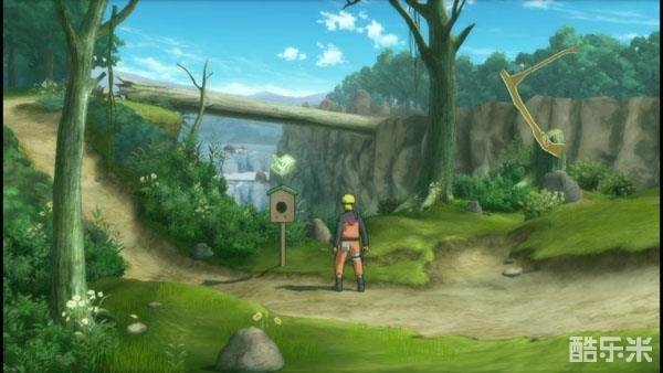 Step4:之后我们就可以去雷之国左下方的区域,那个地方就是鸣人跟奇拉比初入战场,与鼬、长门见面的场景。这个地方是一个死互动,在之前的一个场景有一个独木桥,我们不走独木桥,而是选择进入独木桥左上方的小森林内,就会看到散发着黑色气息的紫色查克拉碎片。