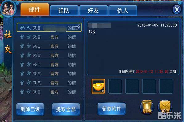 邮件系统有系统接收来自系统或者玩家的信件,也可以写信给其他玩家,发邮件可发文字、非绑物品和元宝